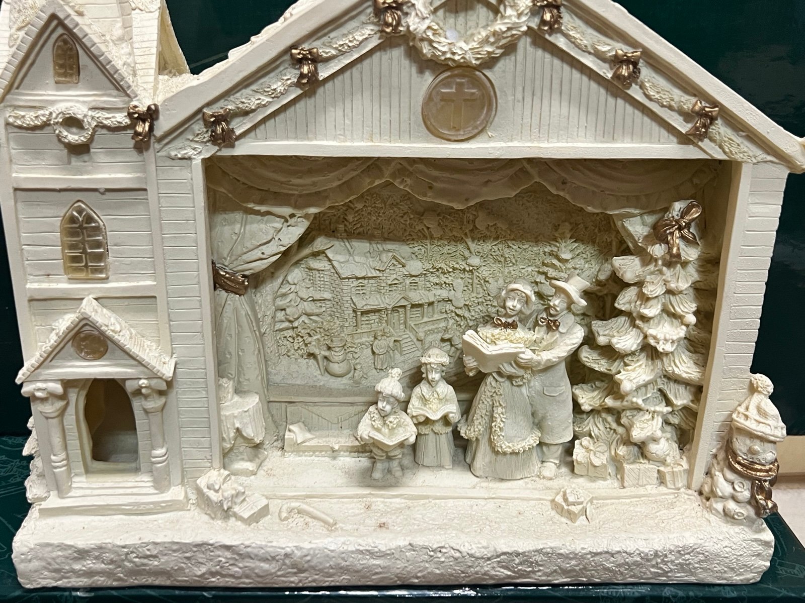 This Kirkland's Vintage Silhouette Church Caroling Scene is in Excellent vintage Condition. I'm sorry I do not have the Original Box. It is Lighted and is 10" Tall and 10" Wide and 3 1/2" Deep. It weighs 2.lbs and 14.oz before packing. Light cord is included.